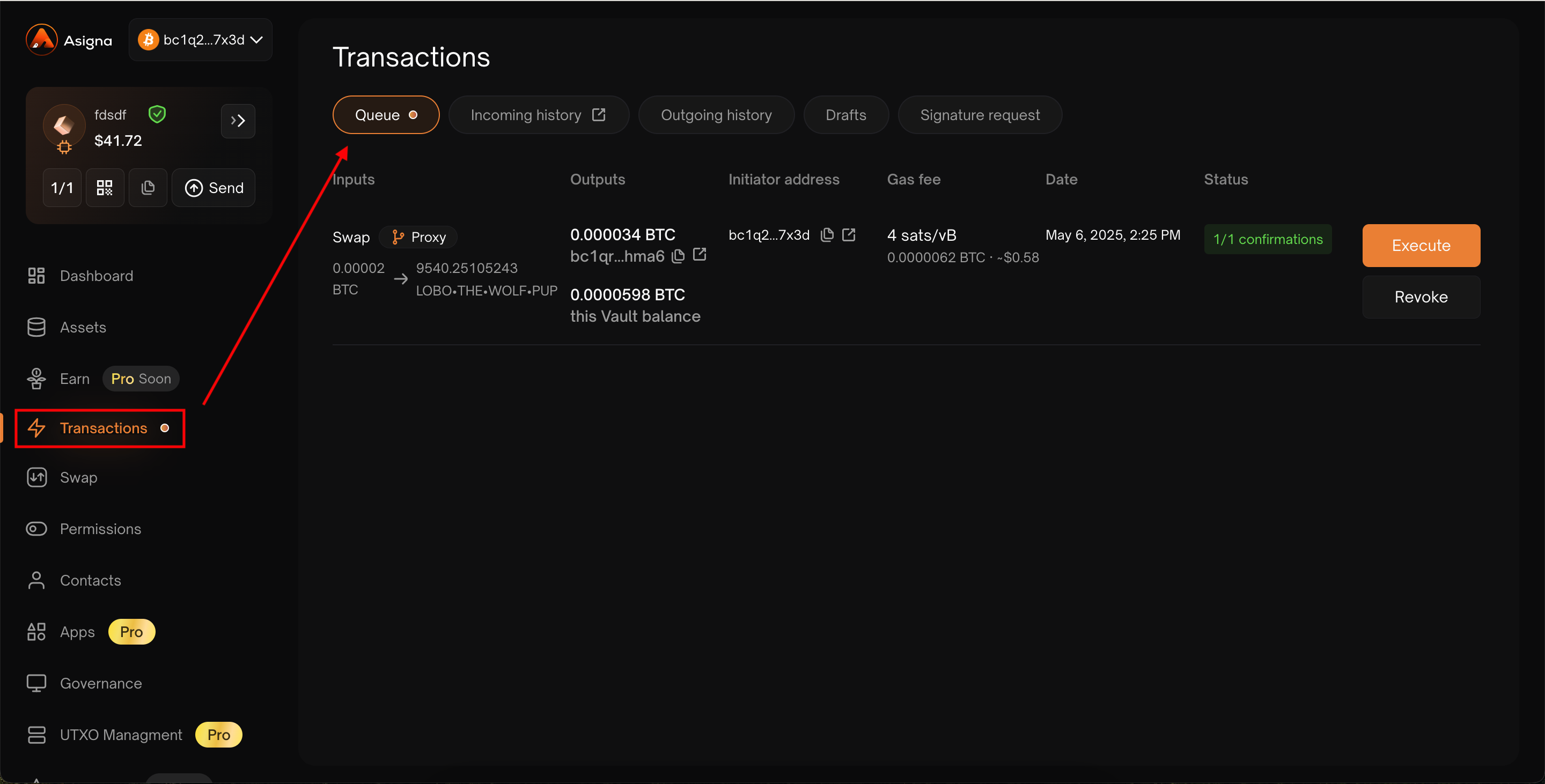 Before the transaction is executed, it must be **signed by the required number of Vault owners**. Once the confirmation threshold is reached, locate this transaction in the **Transactions** section -> **Queue** tab and click the **Execute** button to start broadcasting of the transaction.