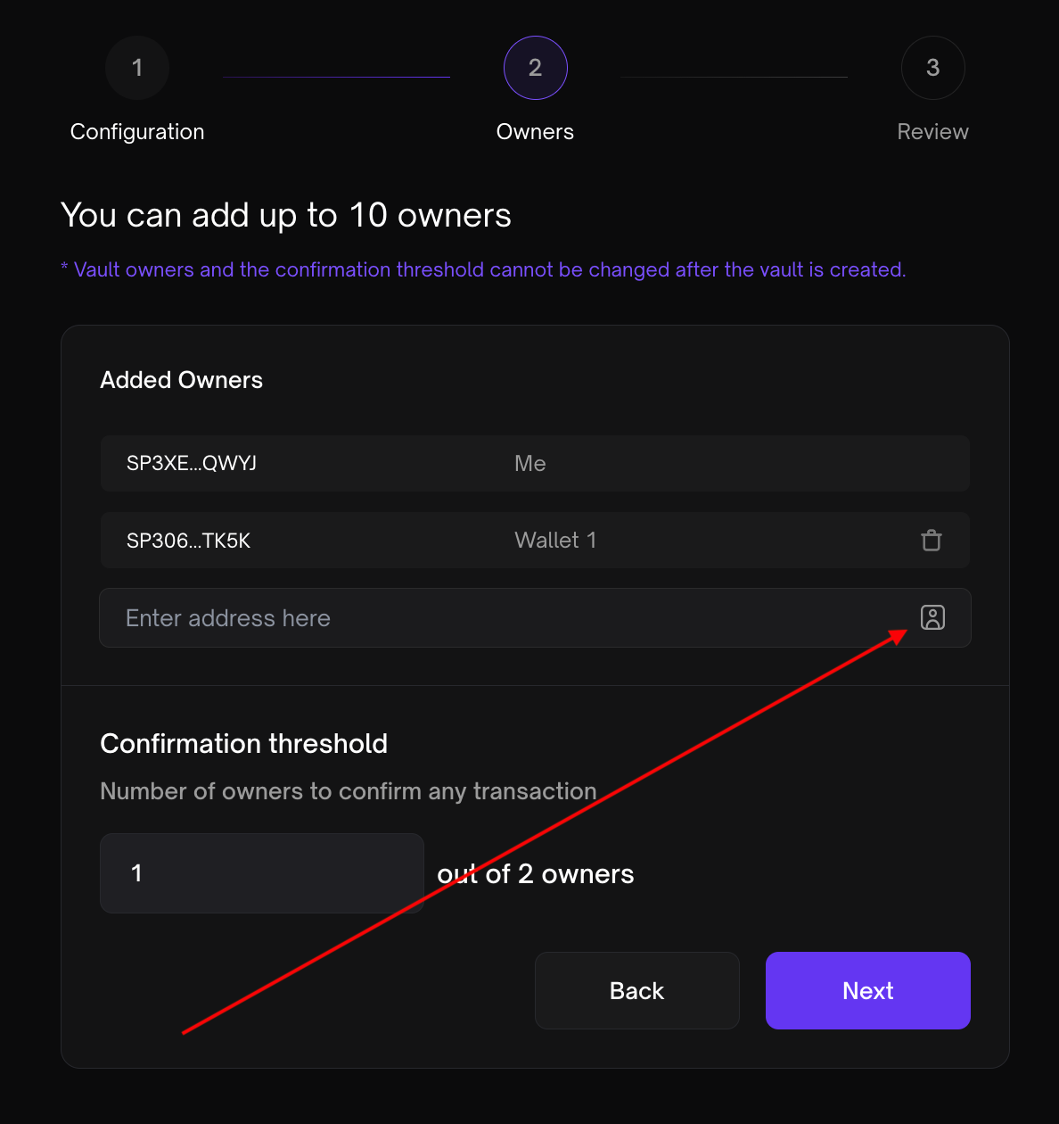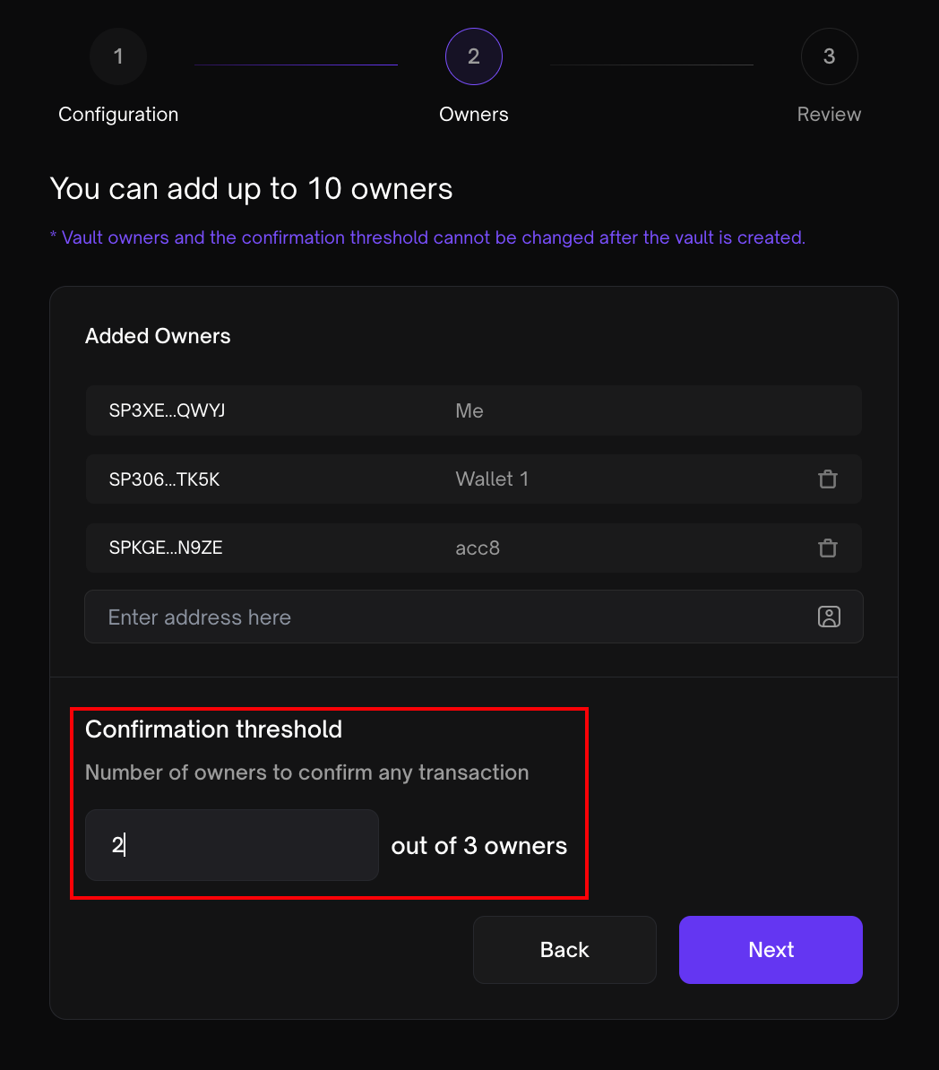 Add the **Stacks addresses** of the co-owners to the wallet configuration. Ensure that each co-owner provides you with their valid Stacks address.&#x20;