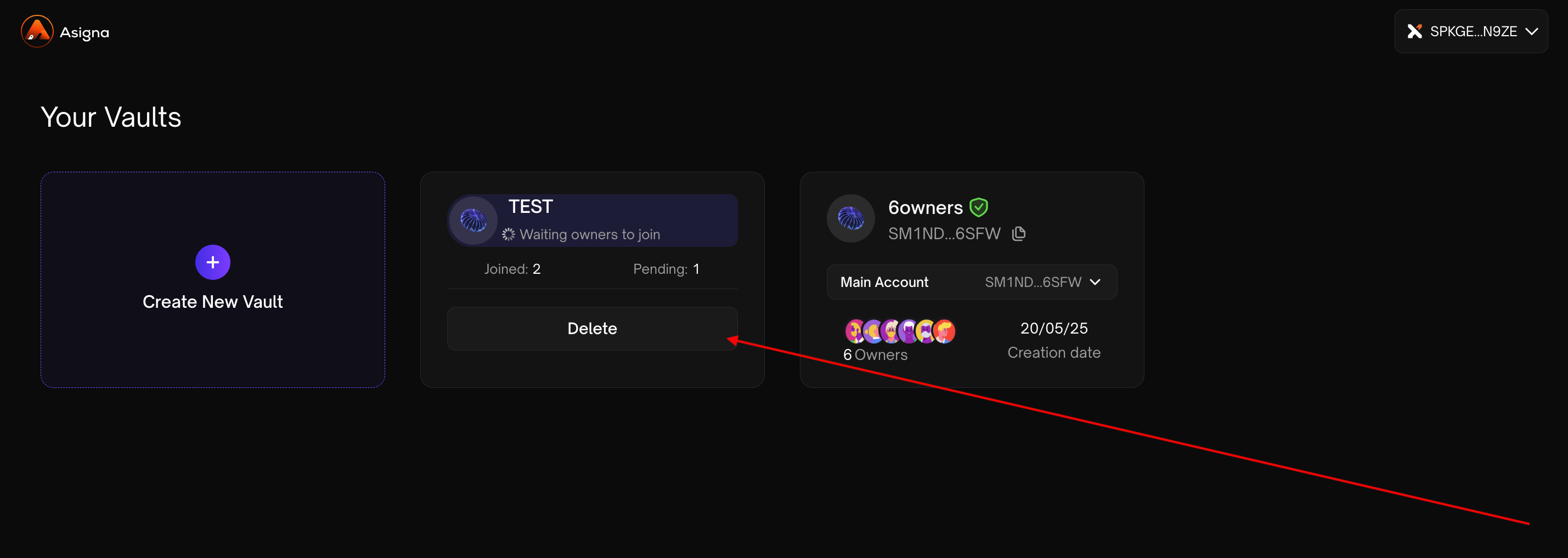 In case you created a Vault by mistake or configured it incorrectly, you can **Delete** it as long as it's still in **Pending** status. Click **Delete** button on the Vault preview or on the sidebar menu of the Vault.