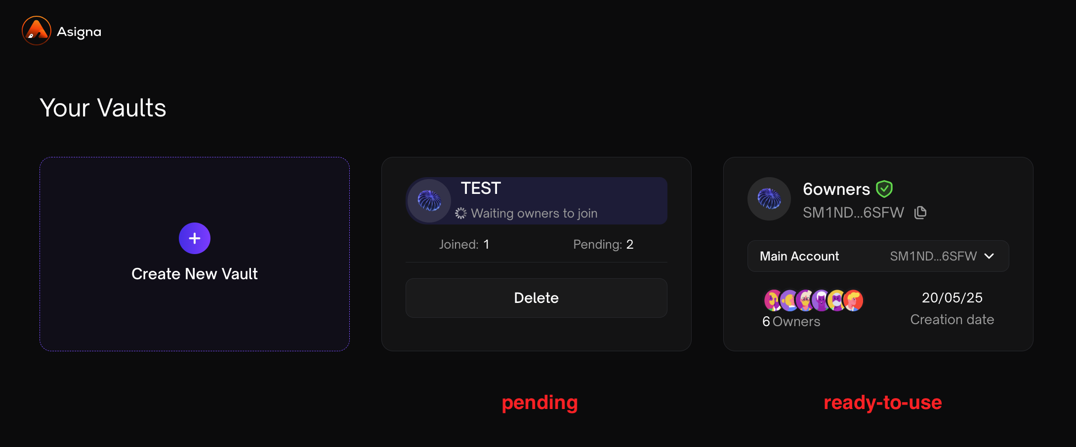 * **Pending** Vault is still waiting owners to join.  All the added owners have to join the Vault to finalize its creation.&#x20;