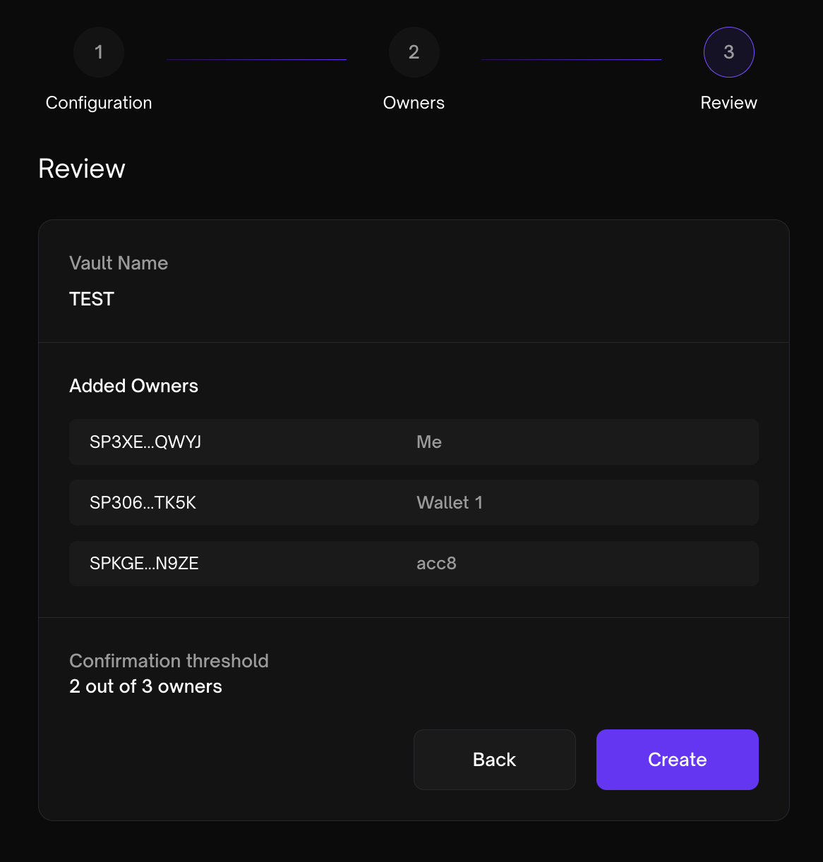 After setting the owners and policy, review your Vault configuration. Once you're satisfied, click **Create** to initialize the multisig creation on the Stacks blockchain. The creation process may take a few moments.&#x20;