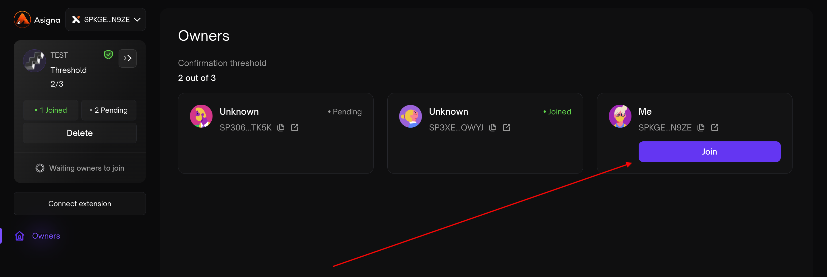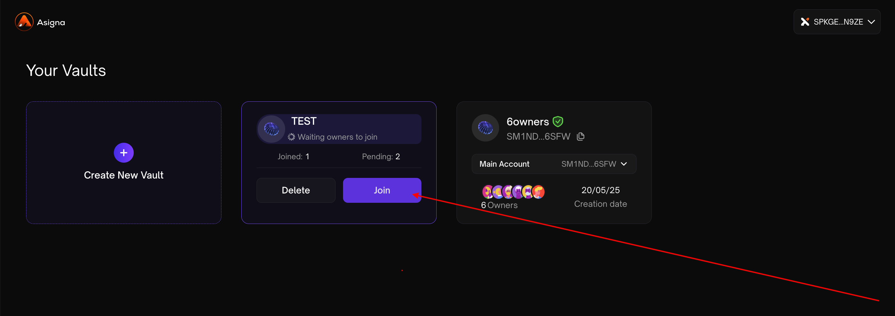To join the pending Vault click **Join** button located on the **Vault preview** or go directly to the pending **Vault page** and click **Join** button on your owner card.